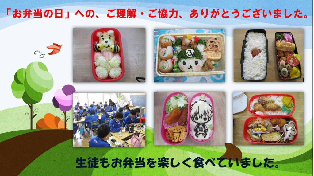 本日は「お弁当の日」です。給食の時間に教室へ行くと、