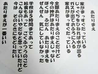 小学校4年生の書いた「あたりまえ」という詩やHPでも紹介した「がれきの中で水を運ぶ少年」と