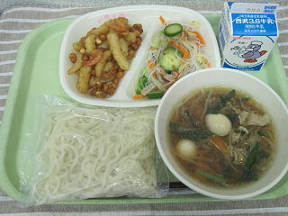 しょうゆラーメン 大豆とポテトの揚げ煮 春雨サラダ 牛乳
