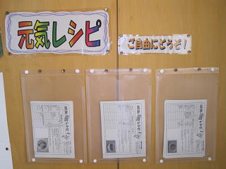 給食室の入り口に、「元気レシピコーナー」を作りました。