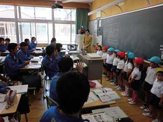 本日(1日)、幼中連携の取り組みとして、「豊里幼稚園の園児のみなさんの訪問」を行いました。