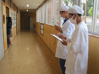 時間を確認し、チェックする給食委員さん。