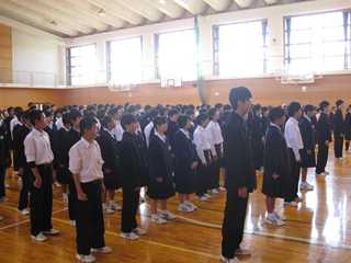本日(5日)の全校朝会は、今週9日(土)に行われる「豊里中学校創立50周年式典」の