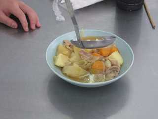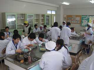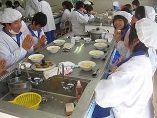 各班で相談して料理品目を決めていますが、「クリームシチュー」「カレー」「ビーフシチュー」「肉じゃが」など、どの班も素晴らしい味でした。2時間の授業ですが、生徒のみなさんが、楽しくしっかりと授業を進めていました。片付けも良くできていました。