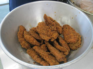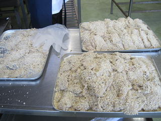 <お肉にパン粉をつけます><中まで火が通っているかしっかり確認します>