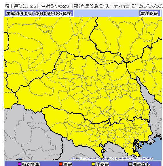 本日(28日)、気象庁より埼玉県他で「雷注意報」が発令され