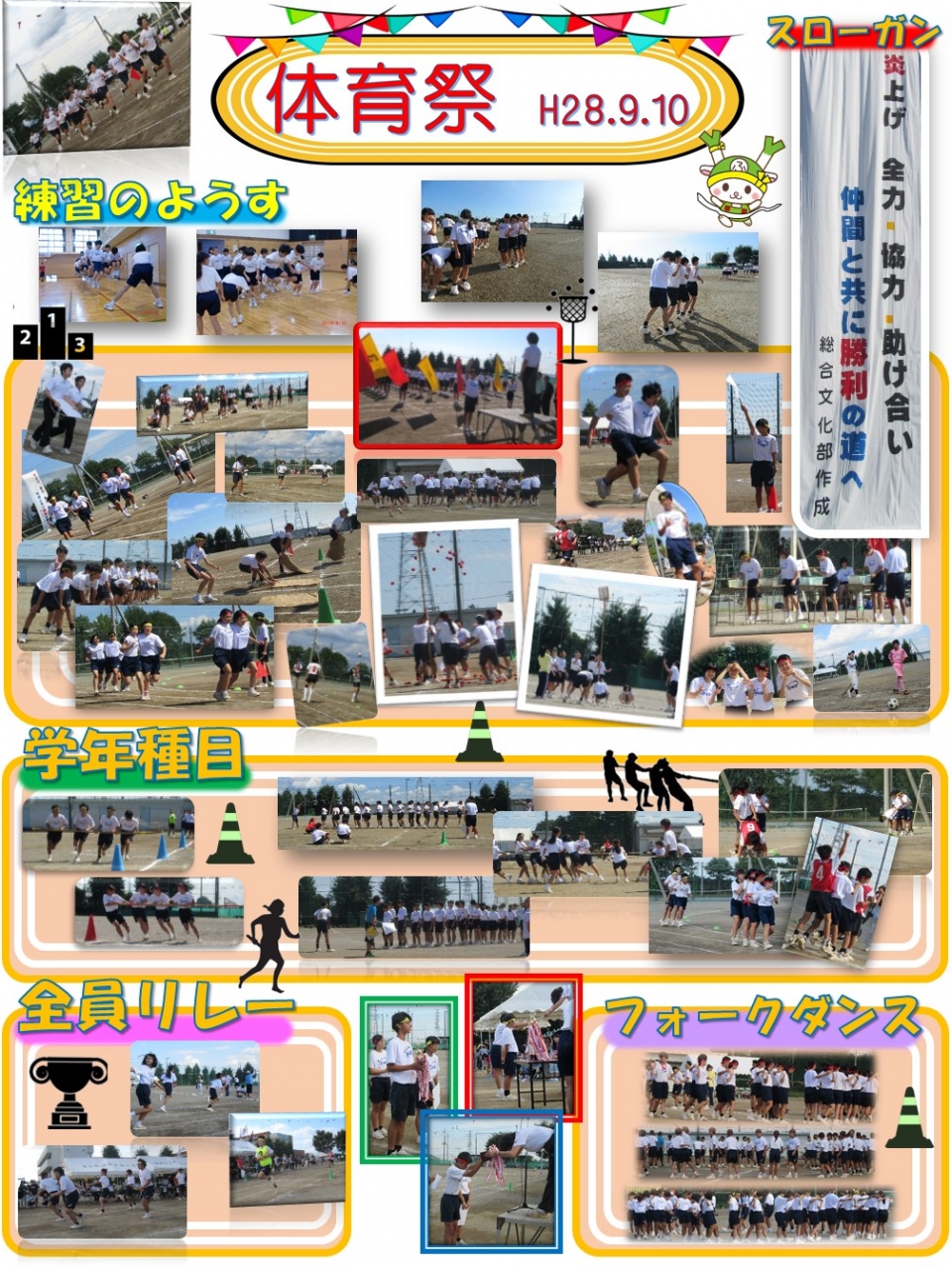 9/10(土)に体育祭が行われました。台風等の影響で天候が危ぶまれましたが、当日は晴れ晴れした青空の下、無事執り行うことができました。優勝したクラスも、できなかったクラスも、仲間のために懸命に走り、全力で応援する姿が見られ、絆の強さが感じられました。