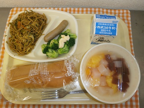 今日の給食の焼きそばをコッペパンにはさんで、焼きそばパンにして食べ