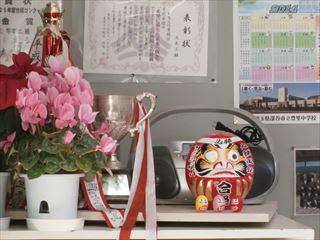 *教室にある「合格だるま」が、みんなを応援していますよ。がんばれ、3年生!