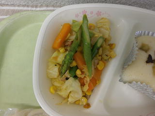 <(新)春野菜のカレー炒め>春野菜を使った新メニューです。春キャベツ、春にんじん、アスパラが