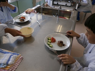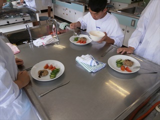 実習を行い、完成した料理を班毎に食べていました。味の感想は、どの班も「とて