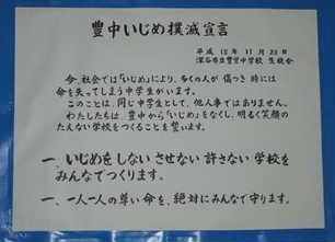 平成18年11月20日に、豊里中生徒会のみなさんが「豊中いじめ撲滅宣言」をつくりこれまで生徒昇降口に掲示してありましたが、年数がたって字が薄くなっていましたので、新しくしました。当時の生徒会のみなさんを中心に全校生徒とともに考えた宣言です。この宣言をみんなで守り、いじめのない学校をつくりましょう。