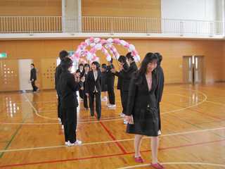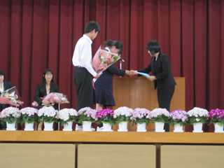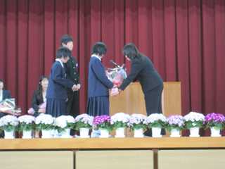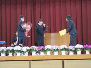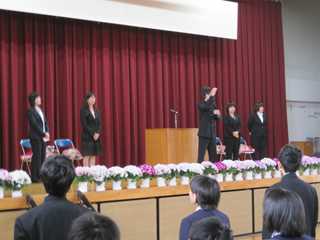 先生方の入場から生徒代表からのお別れの言葉と花束贈呈、そして去られた先生方からのお話を頂き、最後に全員で校歌斉唱をしました。
