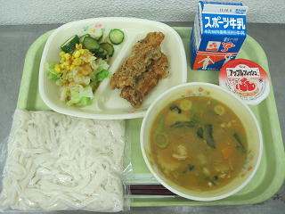カレーうどん、ちくわの石垣揚げ、ミックスサラダ、ゼリー、牛乳