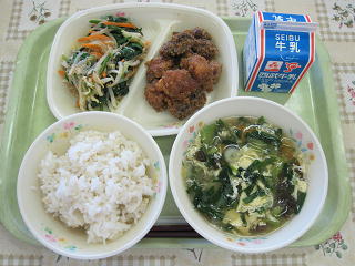 発芽玄米入り御飯、豚肉のごまだれ、深谷ねぎのナムル、ニラ玉スープ、牛乳