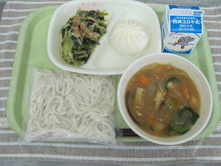 田舎うどん 肉まん 青菜ソテー 牛乳
