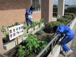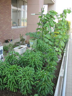 今日は、豊中の「学校ファーム」を紹介します。(昨年9~10月頃の様子)昨年度よりスタートした「学校ファーム」は、職員玄関前の小さな一角と、数個のプランターから始まりました。その後、少しずつ開拓してファームを広げ、この夏には唐辛子やきゅうり、オクラ、ミニトマト、シソを育てました。(今年7月、夏休み直前の様子)現在は、まだまだ元気な唐辛子を残し、冬に向けて新しい野菜を準備しています。楽しみですね★次回は、この夏に育てた野菜について紹介します。