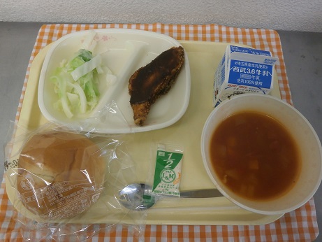 今日の給食のカンパチバーガーは、パンにカンパチの竜田揚げと野菜、