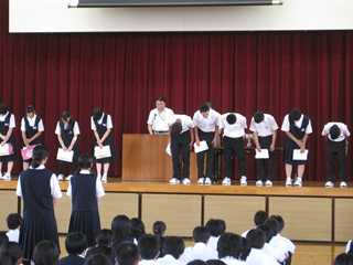 本日の朝会は、先日行われた学校総合体育大会地区予選会や硬筆展等の表彰でした。
