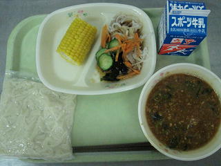ジャージャー麺 とうもろこし 大根サラダ 牛乳今日のとうもろこしは「ゴールドラッシュ」という品種です。ゴールドラッシュは、質のよい甘さと粒皮の柔らかさが特徴で、ひとつひとつの粒がツヤツヤして存在感があります。とうもろこしは、身体のエネルギーになる炭水化物を主として、ビタミンB1、B2、Eや、食物繊維、カルシウム、マグネシウムなどバランス良く含んでいる栄養豊富な食べ物です。