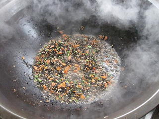 ご飯が進む一品です。ひき肉でそぼろを作り、ひじきや人参を油で炒め、