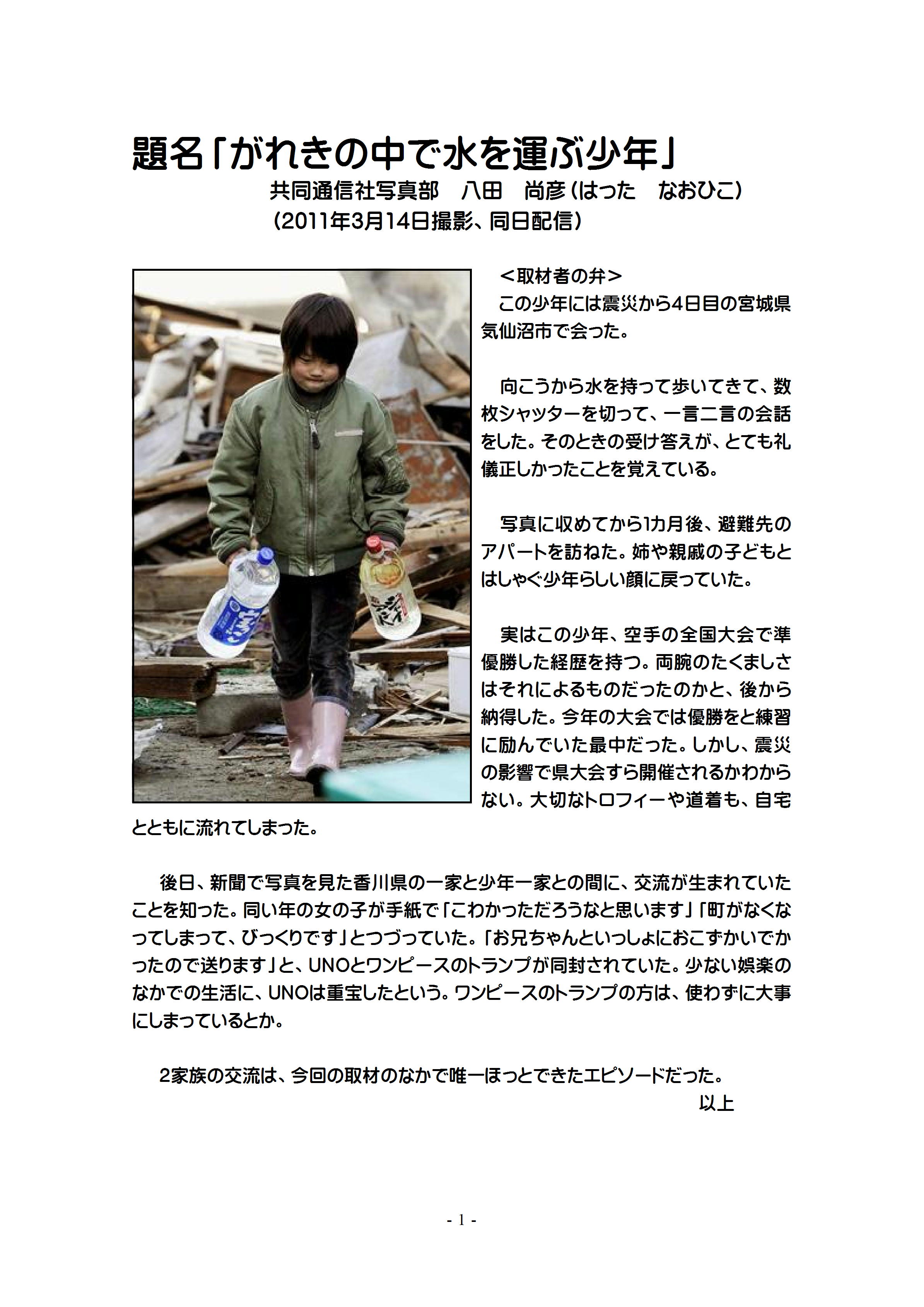 この写真は、東日本大震災直後に宮城県気仙沼市で撮られた「水を運ぶ少年」と題して、共