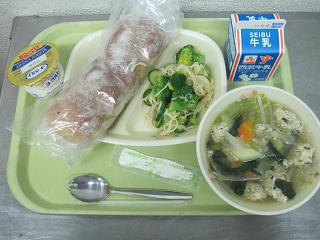 アーモンド揚げパン 豆腐団子スープ ブロッコリーサラダヨーグルト 牛乳本日の給食のブロッコリーサラダのブロッコリーは、先日深谷市より無償でいただいたものです。サラダにしてとても美味しくいただきました。深谷市のブロッコリーは出荷量がなんと全国2位です!!また、深谷の厳しい寒さの中で育つので甘みがあるのが特徴です。ブロッコリーは緑黄食野菜の中でもトップレベルの栄養価を誇ります。