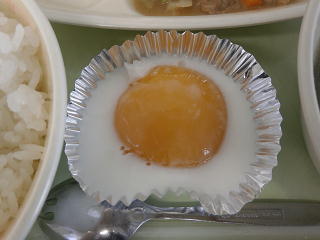パッと見ると「目玉焼き」に見えますが、桃と牛乳かんをつかった