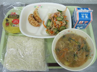 ごま味噌ラーメン、揚げギョーザ、かみかみあえ、デザート、牛乳