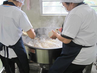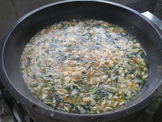 <手作りのすいとんは2人でアツアツの釜へ入れていきます>