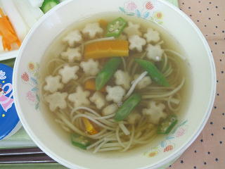 七夕スープのそうめんは天の川を、にんじんと大根は短冊を、