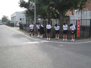 登校時には、教師が立哨指導を行っています。ヘルメット着用や交差点での自転車通行に注意しています。また、生徒会本部や