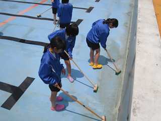 本格的に保健体育の授業で、水泳指導が始まるシーズンとなりました。その為に、生徒全員でプール掃除が始まっています。デッキブラシを使って、きれいにしています。生徒のみなさん、ありがとうございます。
