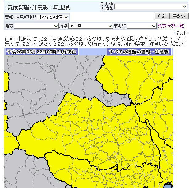 本日(22日)、気象庁より埼玉県他で「強風・雷注意報」が発令され