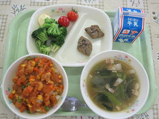 ジャンバラヤ、オニオンスープ、つくね、ブロッコリーとミニトマト、牛乳