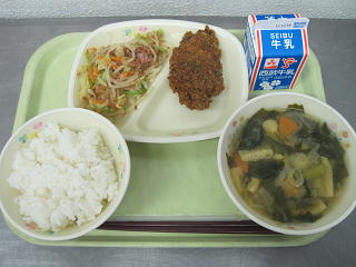 ご飯 かつ おかかあえ 味噌汁 牛乳今日のかつの衣には実は・・・ひじきが混ざっています。気づいた人はいるでしょうか?ひじきはカルシウムや鉄分が豊富に含まれていて、タンパク質やビタミンCと一緒に食べると吸収率がアップします。肉や魚介類、大豆製品や野菜と食べると良いでしょう。今日は3年生の実力テストでした。自分の実力は発揮できたでしょうか・・?テストに勝つ!!ということで、今日はカツ丼でした♪