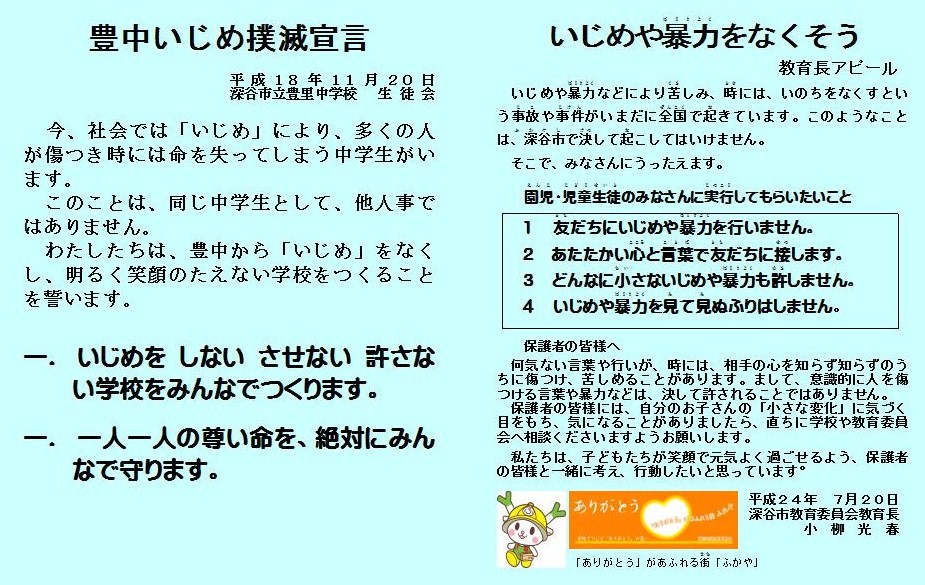 先日の学校だより(9月号)でもお知らせいたしましたとおり、今月は、深谷市内全幼・小・中学校において、「いじめ・暴力行為撲滅強化月間」になっています。