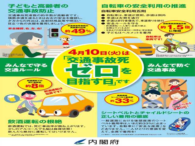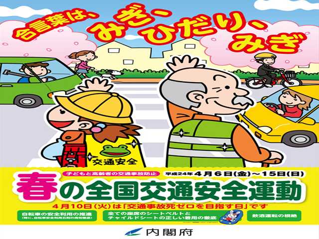 全国春の交通安全運動が、4月6日から15日まで予定されています。また、4月10日は、交通事故死ゼロを目指す日でもあります。