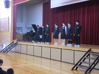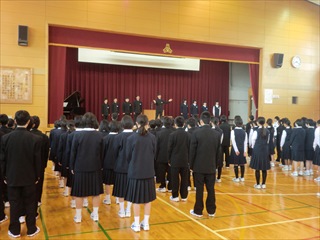 また、この朝会の前には、恒例の全校生徒による校歌練習もありました。