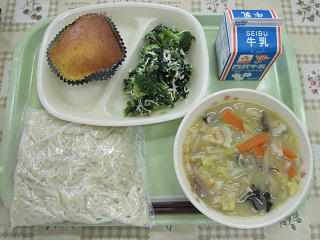 長崎ちゃんぽん、カステラ風パンケーキ、ささみと冬野菜のサラダ、牛乳