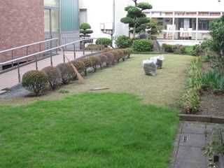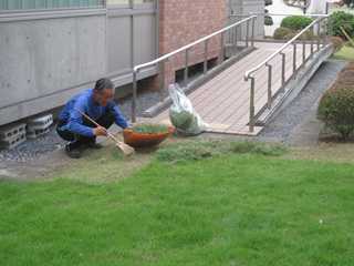 今は、中庭の芝生をきれいに刈り込んでくれています。腰を下ろしながらの作業なの