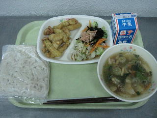 なめこおろしうどん 大豆とポテトの揚げ煮 ツナとひじきのサラダ 牛乳
