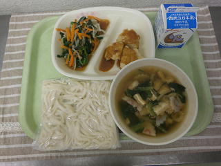 五目うどん 味噌ポテト ほうれん草のナムル 牛乳