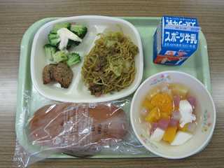 ★今日のメニュー 黒パン インディア焼きそば つくね ブロッコリー フルーツ杏仁ポンチ 牛乳