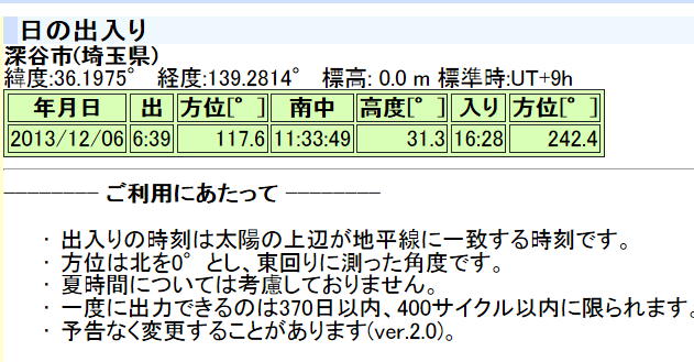があります。そこから入って、指示に従って「深谷市」を設定すると、12月6日の日の入り時刻