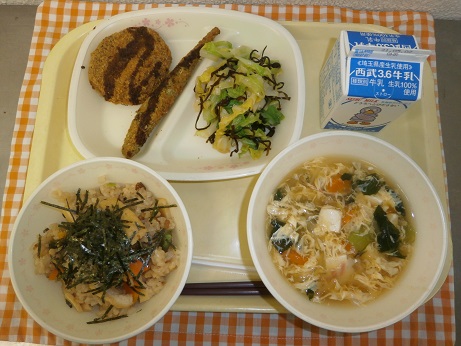 今日の給食はたけのこご飯でした。今が旬のたけのこを人参や油揚げなどと