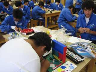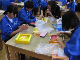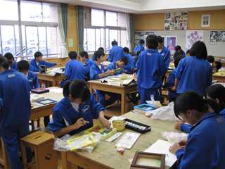 今回は、3年生の美術の授業です。3年生は、今「ボックスアート」作りをしています。箱の中に、自分の描く世界を様々な物を使って表現するものです。一人一人が、全く違った作品を作っていて、素晴らしい発想に驚かされます。是非、楽しく心豊かな作品を作ってください。「作品には、魂がある。」ですね。