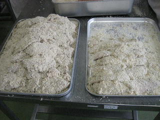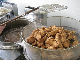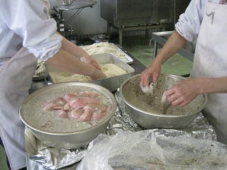 かつを作るときは、バッター液をつける人、パン粉をつける人、揚げる人に