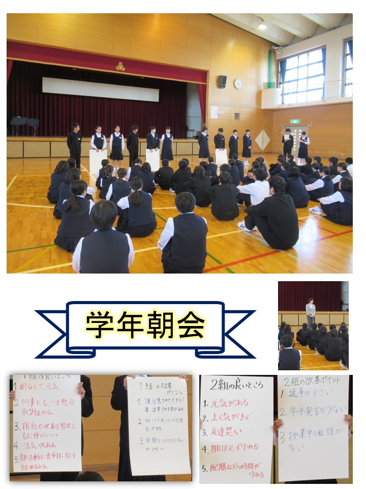 本日の2年生 学年朝会では、各クラスの班長から、クラスの良いところと改善点が