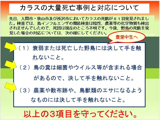 市教委より、「カラスの大量死亡事例と対応について」(埼玉県)からの通知が